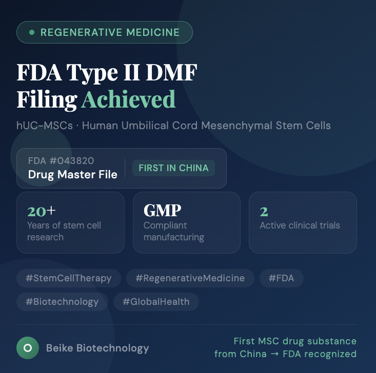 Beike Biotechnology has announced that its Human Umbilical Cord Mesenchymal Stem Cells (hUC-MSCs) have been granted a Type II Drug Master File (DMF) filing by the U.S. Food and Drug Administration (FDA #043820). This makes Beike the first mesenchymal stem cell company in China to receive this level of recognition from the FDA, a milestone that carries real significance for patients, researchers, and the future of global medicine.