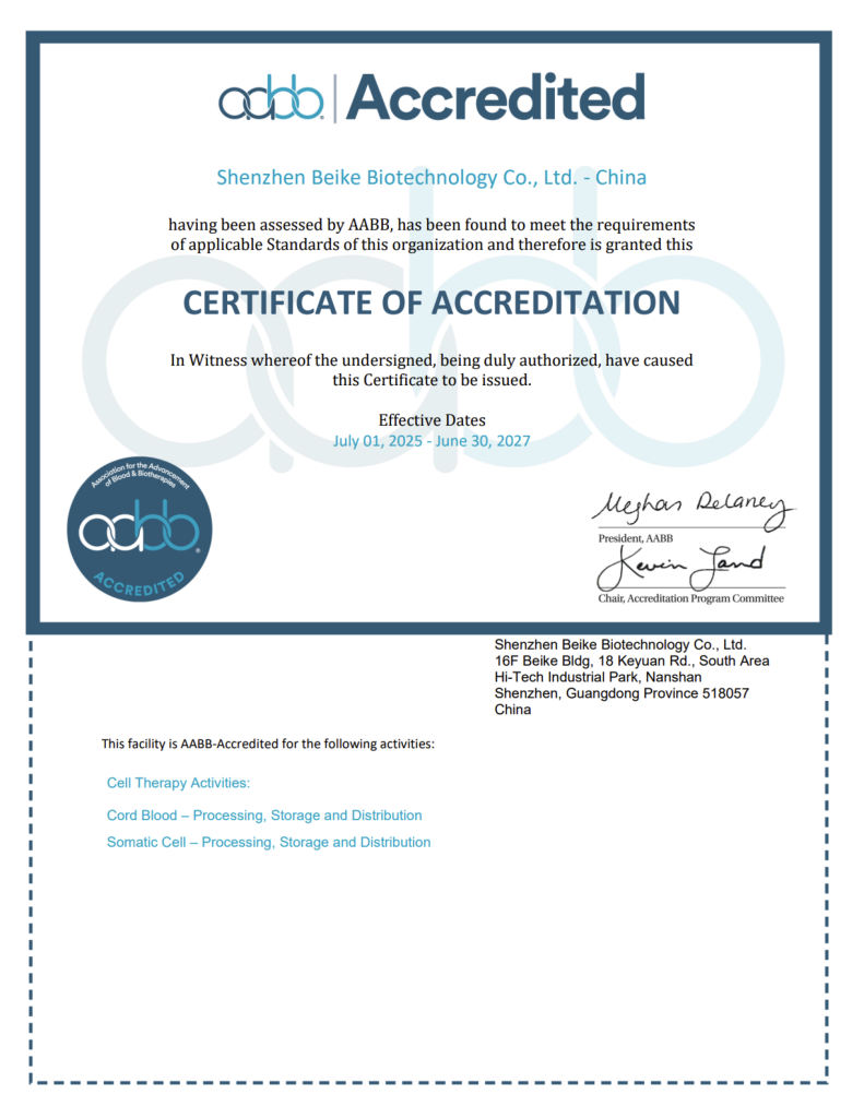 Beike Biotechnology has established more than 20 adult stem cell processing laboratories, in accordance with GMP standards, and has been awarded ISO9001 and ISO17025 certificates. Jiangsu Beike’s inspection center was accredited by the China National Accreditation Service for Conformity Assessment (CNAS) in 2011, and it is the first adult stem cell processing laboratory accredited by CNAS.